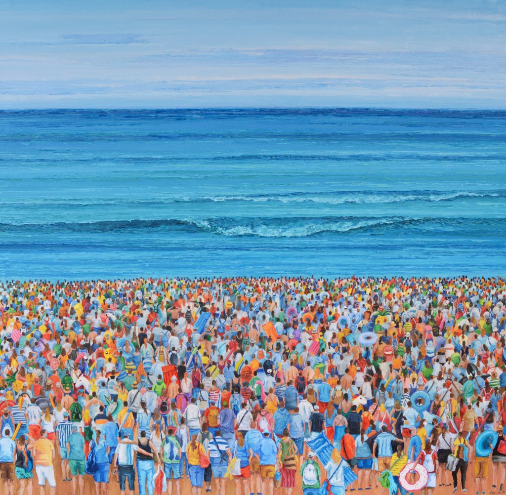 «La espera». Una playa abarrotada a la orilla del mar, donde el horizonte se pierde entre flotadores y kit de playa, a la espera de retomar la vida. Un reflejo del momento que vivimos. Un anhelo de aquello que esta situación nos ha robado. Como deseo, recuperar nuestra libertad, las ilusiones, y las ganas de vivir. Obra que nació durante los largos meses de cuarentena.